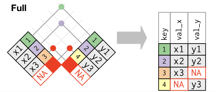 full_join(): the output has all cases from the left and the right. This is less common than the first two join operators.